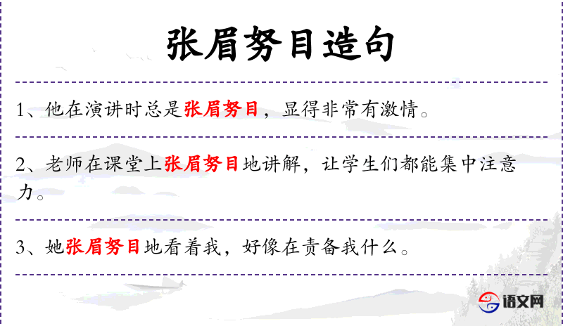 - 张眉努目:形容表情夸张,引人注目。