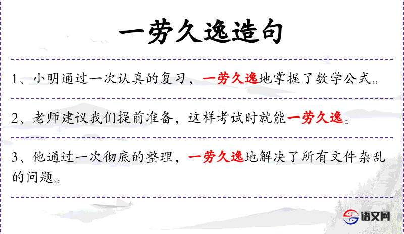 1. 【一劳久逸】 - 辛苦一次,把事情办好,以后就可以不再费力了。同“一劳永逸”。