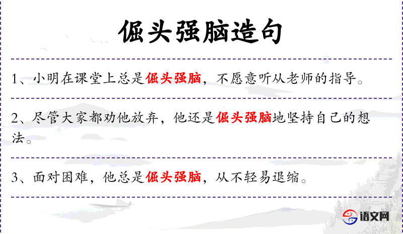 - 倔头强脑:形容一个人性格倔强,不易改变主意。