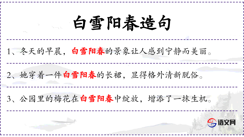 7. 【白雪阳春】 原指战国时代楚国的一种较高级的歌曲。比喻高深的不通俗的文学艺术。