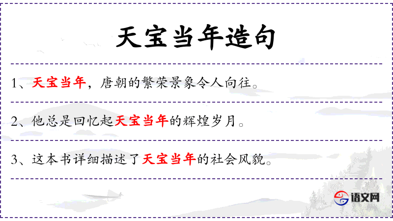 1. 【天宝当年】 比喻追忆往昔盛事。天宝:唐玄宗李隆基的年号,是唐王朝极盛之时。