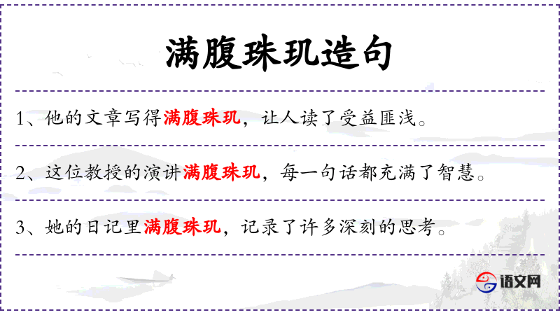 4. 【满腹珠玑】 - 玑:不圆的珠子;珠玑:比喻优美的文章。形容人很有文才。