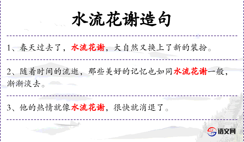 1. 【水流花谢】 - 谢:脱落。指河水流逝,花儿也凋谢了。形容景色凋零残败,用来比喻局面残破,好景已不存在,无法挽回。亦作“花谢水流”。