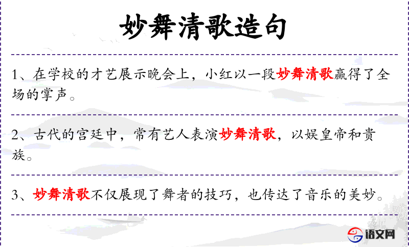 1. 【妙舞清歌】 美妙的舞蹈,清越的歌声。