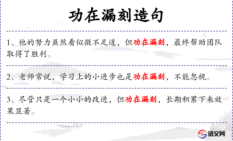 - 功在漏刻:比喻微小的努力也能产生累积的效果。