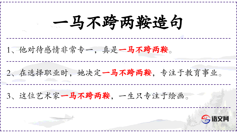 1. 【一马不跨两鞍】 - 一匹马不能套两个马鞍。比喻一女不嫁二夫。