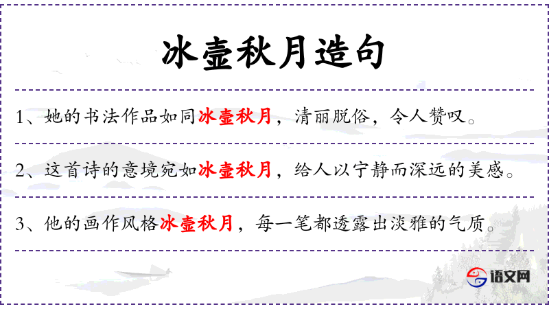 - 宾语:冰壶秋月,山清水秀,意境悠远