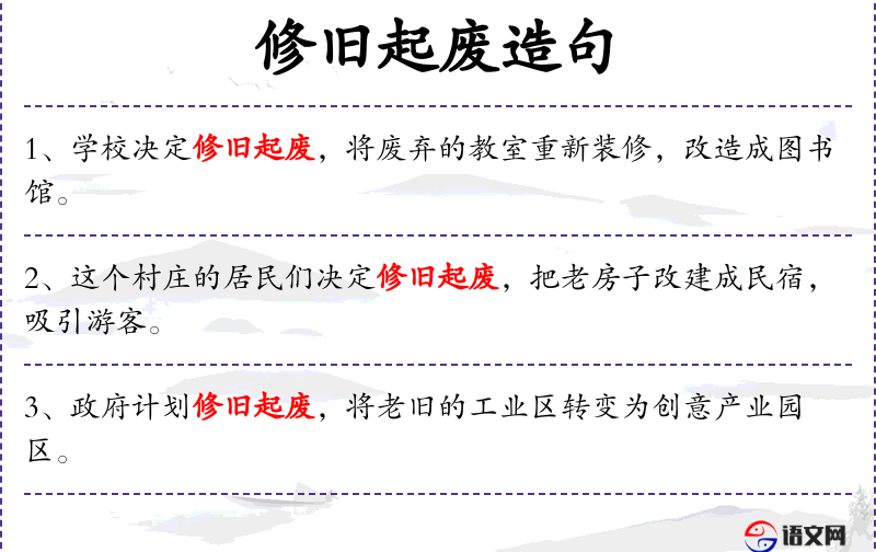 - 修旧起废:指修复和利用废弃的设施或物品。