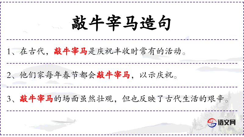 句子中的“敲牛宰马”可能与某些地区的传统屠宰俗相关。了解这些俗可以帮助更好地理解句子的文化背景。