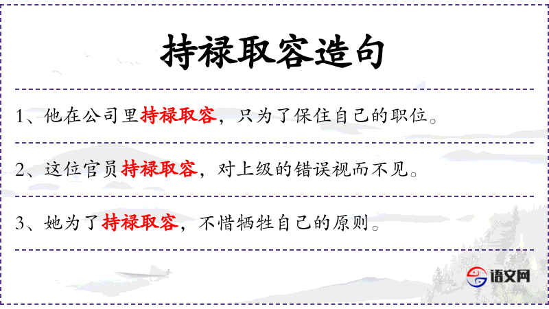 - 持禄取容:为了保持自己的地位和利益而迎合他人。