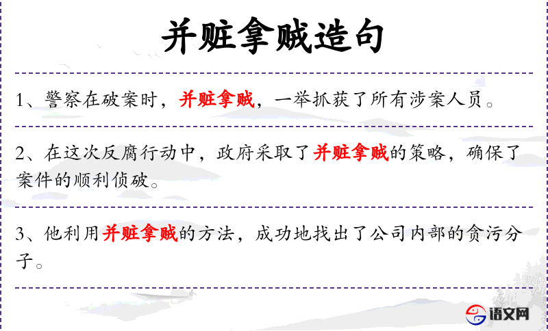 - 不同句式:“他通过采用并赃拿贼的手段,成功地揭露了公司内部的贪污行为。”