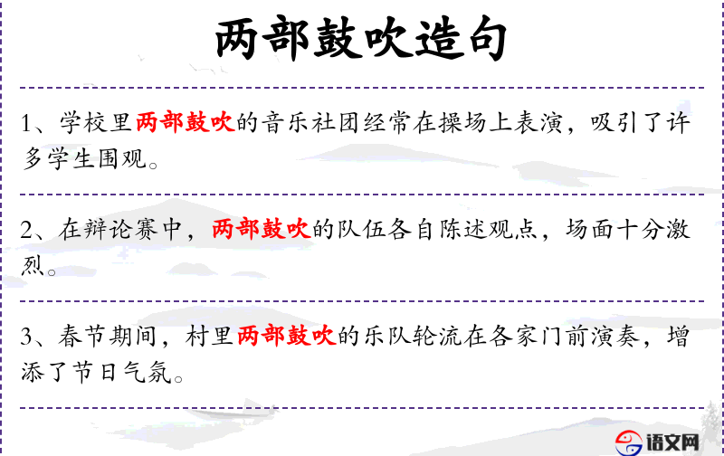 1. 【两部鼓吹】 鼓吹:古时仪仗乐队的器乐合奏。两部器乐合奏。特指蛙鸣。