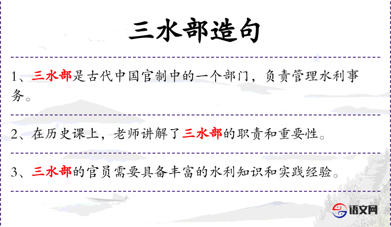 1. 【三水部】 - 南朝梁何逊﹑唐张籍﹑五代孟宾于三人的合称。三人均曾任水部郎,故称。