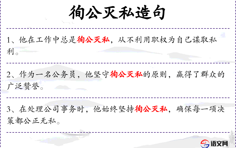 - 徇公灭私:为了公共利益而牺牲个人利益。