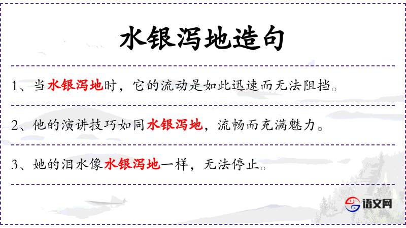 3. 【水银泻地】 - 泻:流得很快。水银倒在地上,很快就会全部渗入土中。比喻无微不至,极为细密周到。也比喻非常流畅,一气呵成。