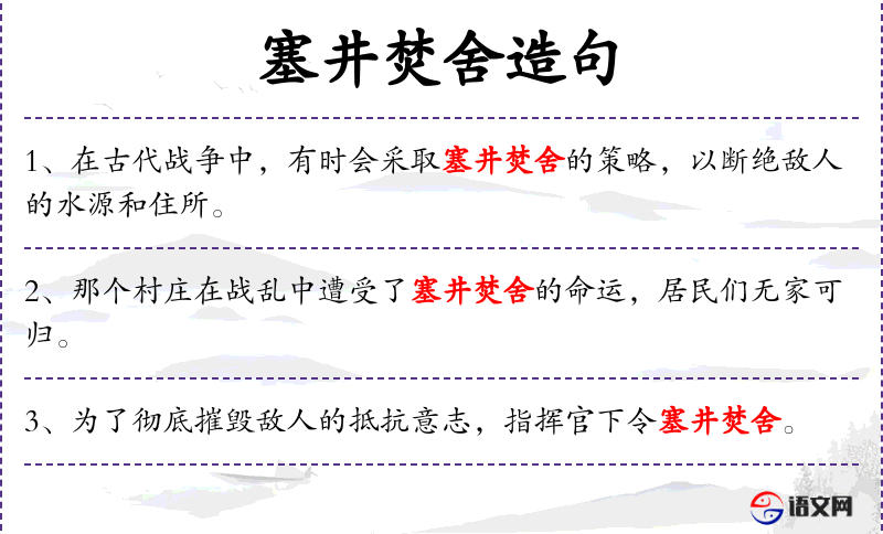 - 塞井焚舍:古代战争中的一种破坏性措施,堵塞水井和焚烧房屋,以防止敌人使用。