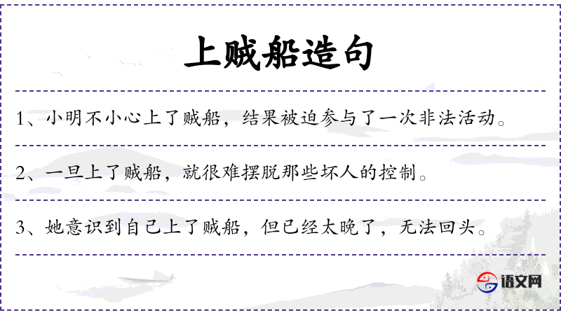 1. 【上了贼船】 - 比喻已入歧途,难以抽身。