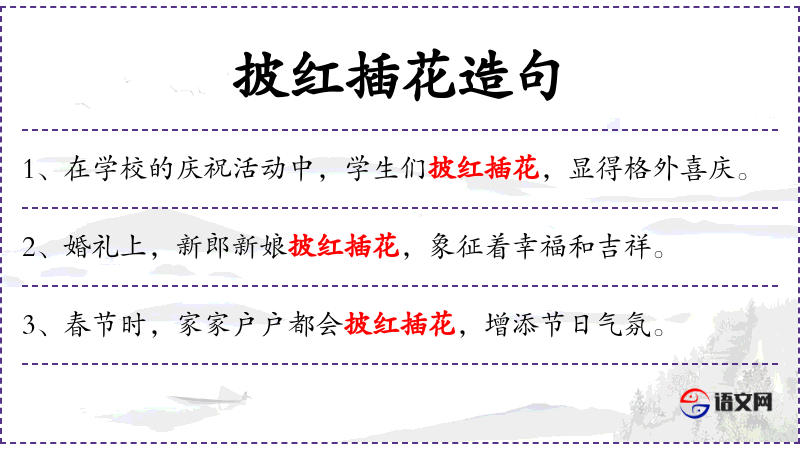 - 谓语:披红插花,展现