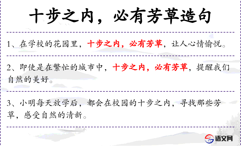 - 每天放学后,小明都会在校园的十步之内寻找芳草,体验自然的清新。