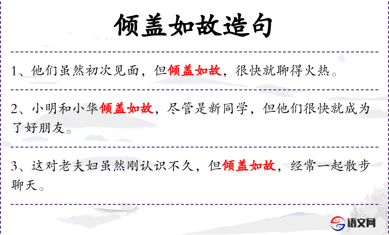 - 谓语:“虽然刚认识不久,但倾盖如故,经常一起散步聊天。”
