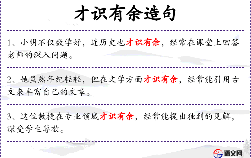 3. 【才识有余】 才:才能;识:见识。才能和见识都有剩余。指才能很高,见识极广。