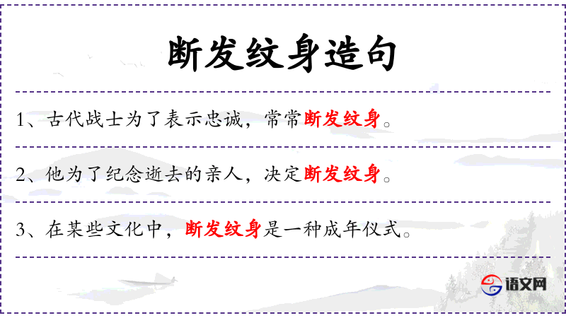 断发纹身可能在某些文化中具有特殊的象征意义,比如在某些部落文化中,纹身是成年礼或身份的标志。了解这些文化背景可以更深入地理解句子的含义。