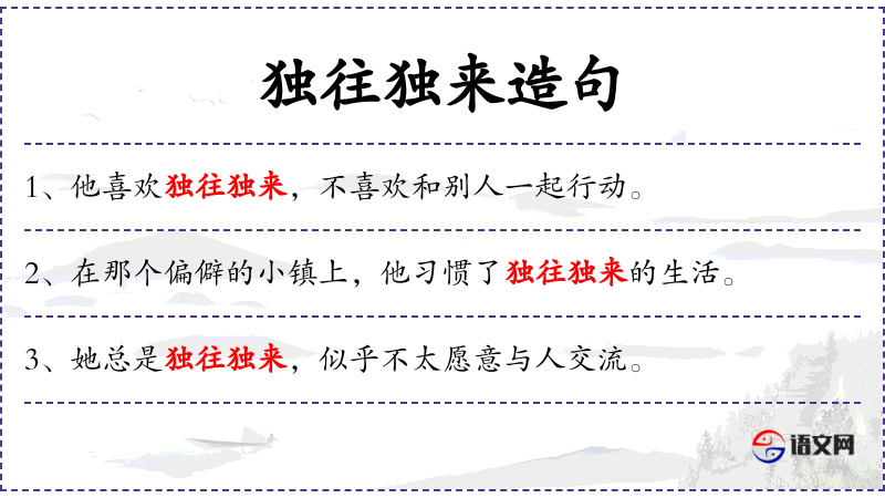 3. 【独往独来】 指行动自由,没有阻碍。又指作文用字独具一格,后指单独往来。