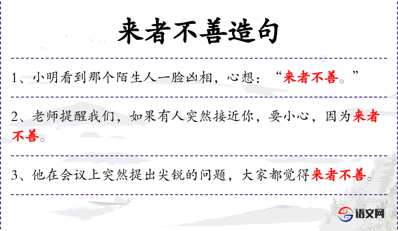 4. 【来者不善】 善:亲善,友好。强调来人不怀好意,要警惕防范。