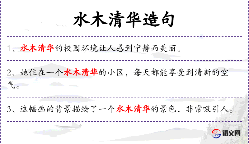 3. 【水木清华】 - 水:池水,溪水;木:花木;清:清幽;华:美丽有光彩。指园林景色清朗秀丽。