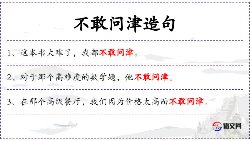 1. 【不敢问津】 - 问津:询问渡口,问路。指高贵的、深奥的事物不敢过问或尝试。