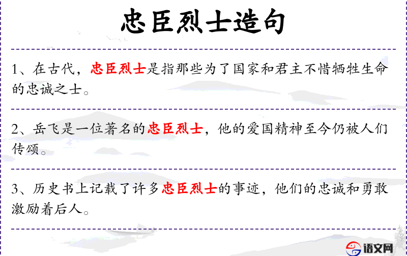 - 忠臣烈士:忠诚于国家和为国捐躯的人。