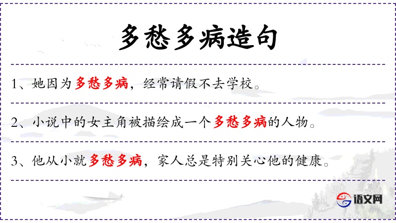 - 多愁多病:形容词短语,形容一个人情感丰富且身体多病。