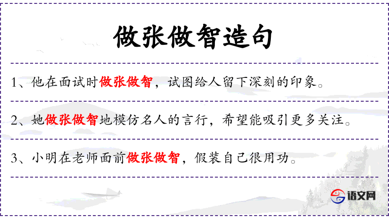 - 做张做智:这是一个成语,意思是装模作样,故意表现出某种样子。