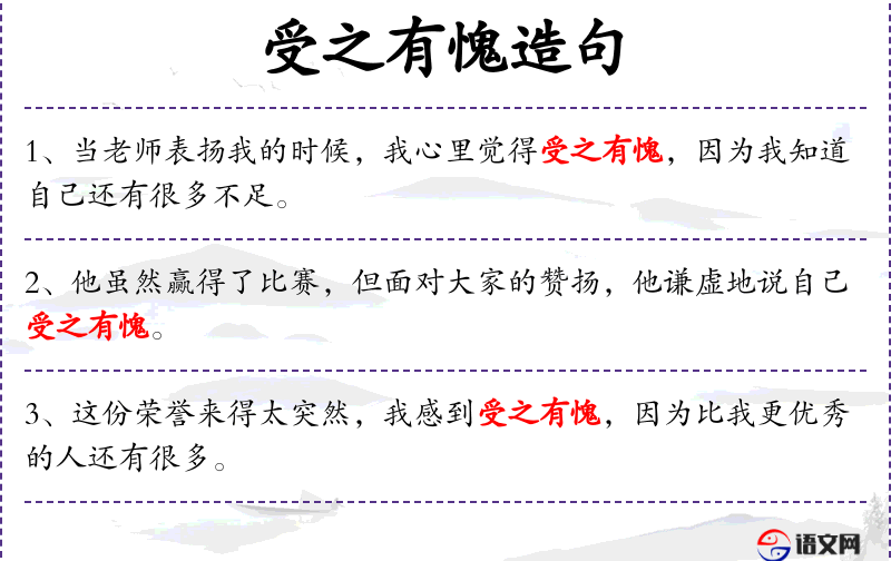 2. 【受之有愧】 指接受某种馈赠和奖赏心里感到惭愧。多用作自谦之辞。