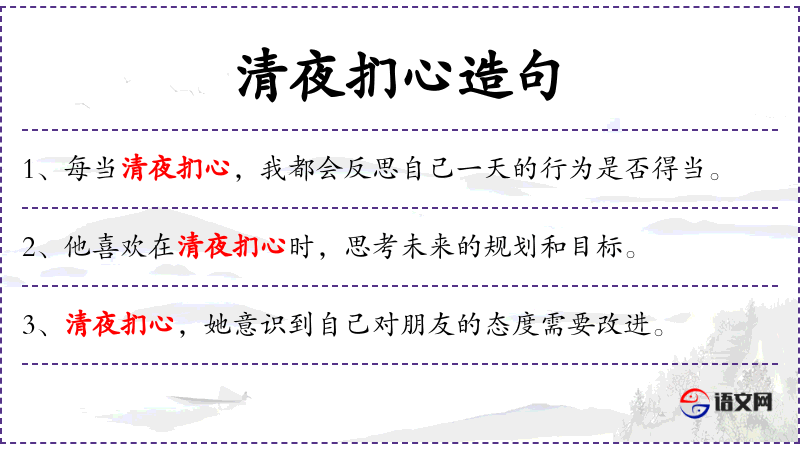 5. 【清夜扪心】 清:清静;扪:按摸。指深夜不眠,进行反省。