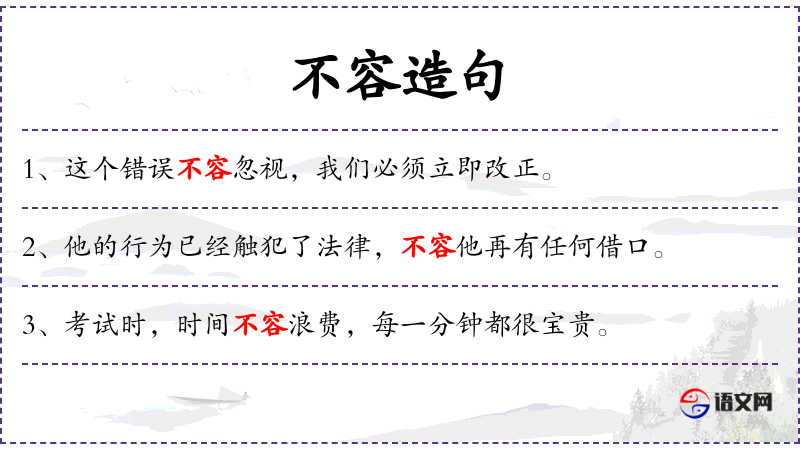 1. 【不容】 - 不许;不让:~置疑|~置喙|任务紧迫,~拖延。