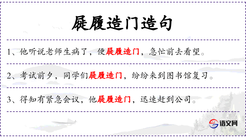 句子:“为了赶上早班飞机,他屣履造门,凌晨就出发了。”