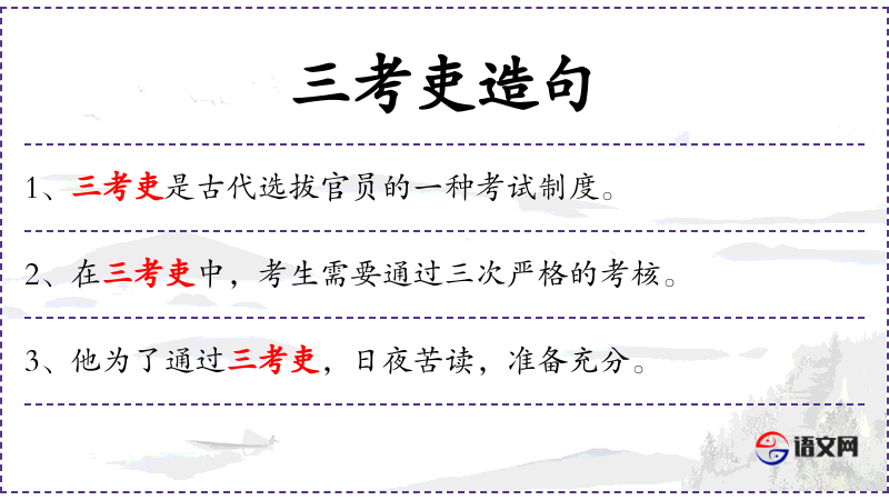 1. 【三考吏】 - 具有三考资格的吏员。明代吏员三年一考绩,六年再考,九年考满,再经吏部考试,合格者可以授官。