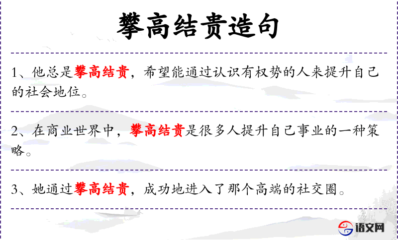 - 文化背景中,攀高结贵可能被视为不道德或不可取的行为,因为它依赖于外部力量而非个人努力。