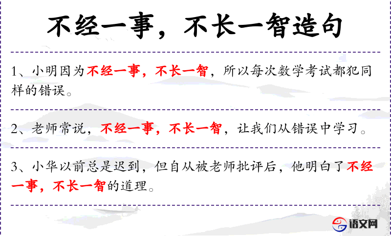 - 不经一事,不长一智:成语,意思是只有亲身经历某事,才能增长智慧。