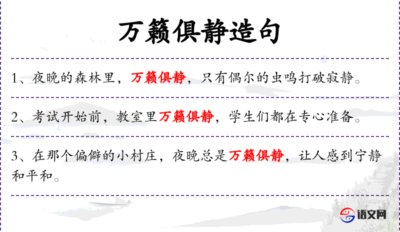 - 万籁俱静:形容环境非常安静,没有一点声音。