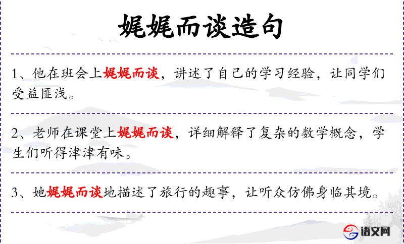 - 娓娓而谈:形容说话连续不断,生动有趣。