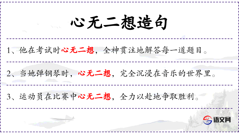 - 心无二想:专心致志,没有其他杂念。
