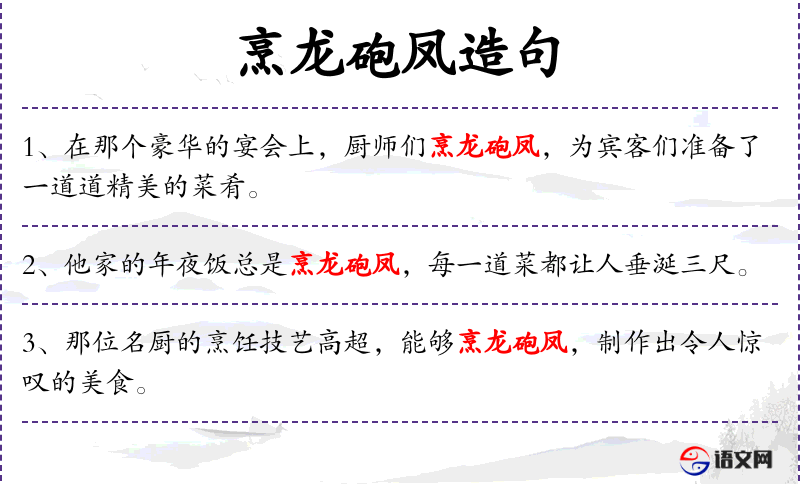 5. 【烹龙砲凤】 - ①比喻烹调珍奇肴馔。亦形容菜肴豪奢珍贵。②比喻高超的艺术技艺。亦作“烹龙庖凤”。亦作“烹龙煮凤”。