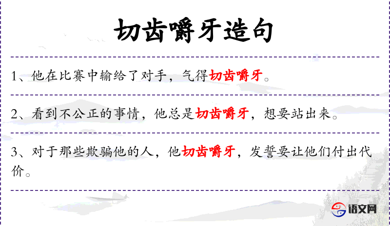 - 英文:使用了“grinds his teeth”来表达愤怒,与“切齿嚼牙”相呼应。