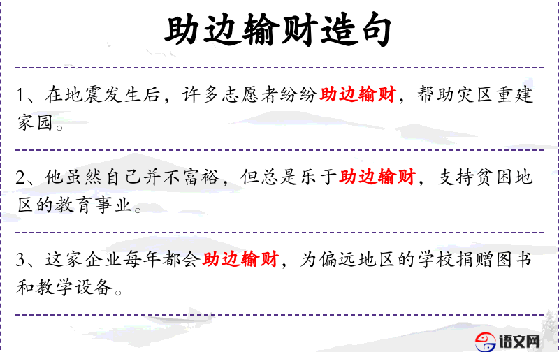 - 积极响应:指热情、主动地参与或支持某事。 *. 助边输财:指帮助边远地区或困难群体输送财物。