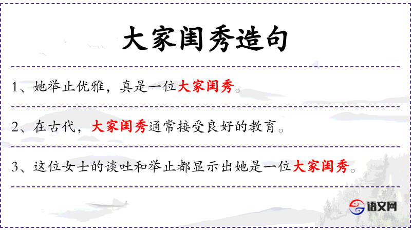 - 大家闺秀:指出身名门望族的女子,通常用来形容有教养、有品位的女性。