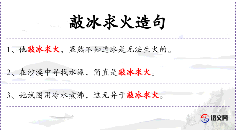 句子中的“敲冰求火”是一个成语,源自古代的寓言故事,用来形容不可能实现的事情。这个成语在文化中广泛使用,用以警示人们不要做无用功或追求不可能的目标。