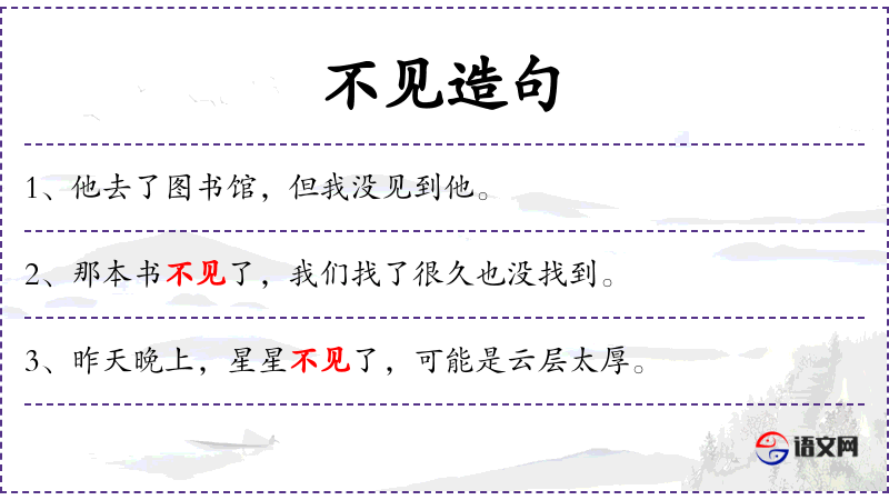 1. 【不见】 - 不见面:~不散|这孩子一年~,竟长得这么高了;(东西)不在了;找不着(后头必须带“了”):我的笔刚才还在,怎么转眼就~了?