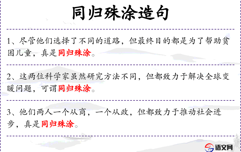 - 同归殊涂:虽然途径不同,但最终目的相同。